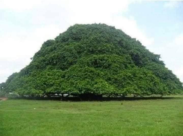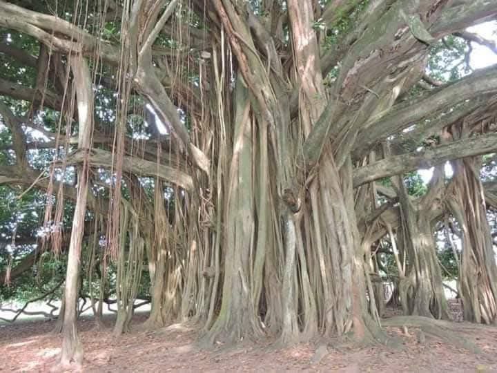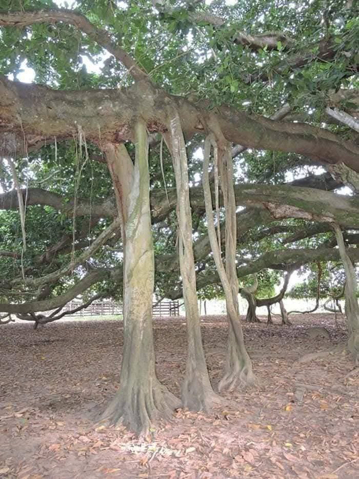 التي يصل قطر انتشارها الى حوالي 75 متر؛ ربما هذا لا يصدقه العقل البشري حيث أنه من المنطق لا توجد أغصان مهما بلغت درجة صلابتها وقوتها أن تمتد وتنتشر أفقيًا هذه المسافة الكبيرة وهي حرة بذاتها دون دعامة. وللتوضيح أنه من بديع صنع الله سبحانه وتعالى أن هذه الشجرة كلما امتدت أغصانها أفقيًا كلما تدلت من هذه الأغصان جذور هوائية تنمو للأسفل حتى تتصل بالارض وتستقر وتكون بمثابة أعمدة قوية الهيئة لحمل وتدعيم ومساعدة هذه الأغصان الصخمة على الانتشار لمسافات طويلة دون توقف.